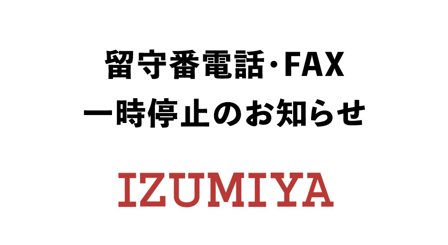 いつもIZUMIYAをご愛顧頂き誠にありがとうございます。 このたび弊社本社ビルにおいて、下記日程で電気工事を実施する運びとなりました。工事に伴い、FAX・留守電でのご注文が下記時間帯に限りご利用頂けなくなります。ご不便をおかけいたしますが、ご理解、ご協力のほどをよろしくお願い申し上げます。